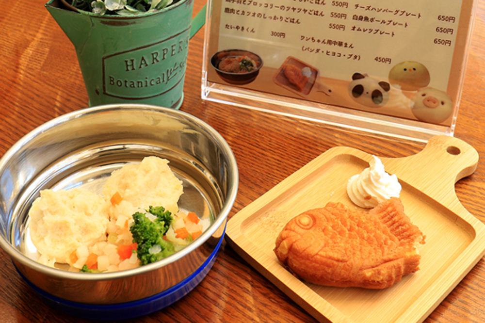 また、ワンちゃん用には、「鶏むね肉とサツマイモのごはん」や「チーズハンバーグプレート」などの全6種類のワンちゃん専用メインディッシュをはじめ、豚まんやたい焼き、ロールケーキなど全11種類揃えております。
