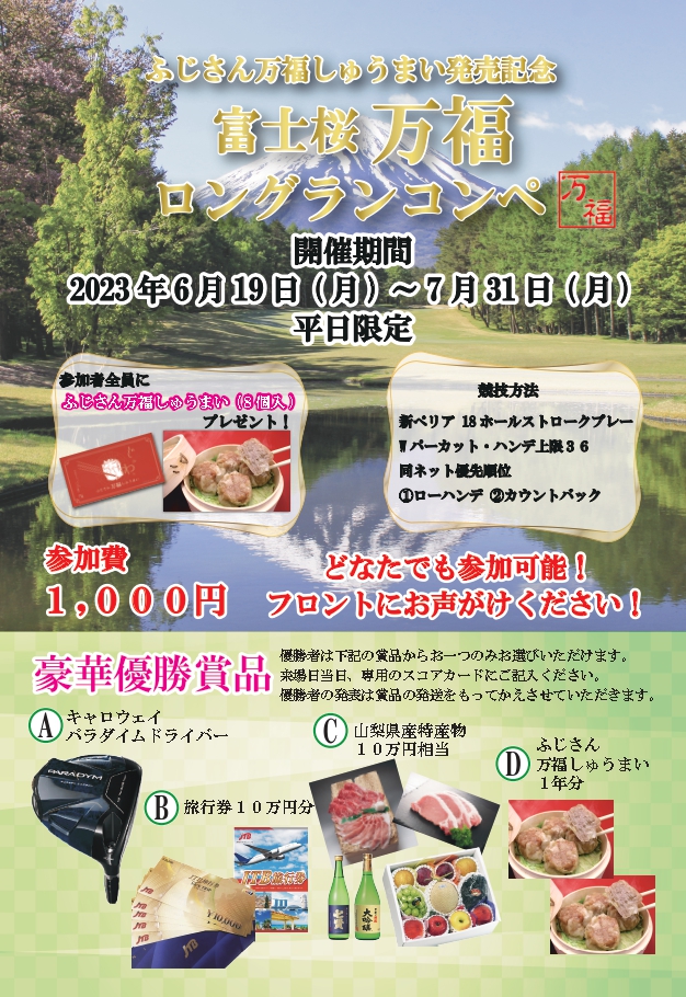 富士桜カントリー倶楽部で販売中の大人気お土産シュウマイ「ふじさん万福しゅうまい」の発売を記念して、2023年6月19日(月)~7月31日(月)までの期間中、「富士桜”万福”ロングランコンペ」を開催いたします!