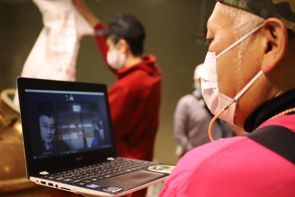 5月23日の仕込み日には、コロナ禍のため、山梨県の富士桜高原麦酒と、秋田県の田沢湖ビールをZoomでつなぎ、富士桜高原麦酒・宮下醸造長と、田沢湖ビール・初代工場長の小松氏と現工場長(ヘッドブルワー)の佐々木氏と情報交換を行いながら仕込みを進めました。