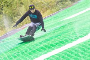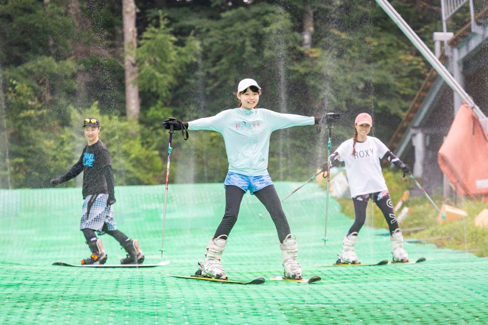 ふじてんリゾートの「サマーゲレンデ」は、滑走性に優れた人工マット「カービングマット」を地面に敷き詰めており、夏でも雪上に近い感覚でスキー・スノーボードを楽しむことができます。冬のスキー板・スノーボード・ブーツをそのまま使用し滑走できるので、冬に向けてのスキルアップに最適です。カービングマットは、スキー・スノーボードの板のエッジ部分がグリップしやすく、シャープなターン感覚が味わえるよう素材の硬さやピンの長さが調整されています。また、コース全体に散水することで滑走性を高めます。