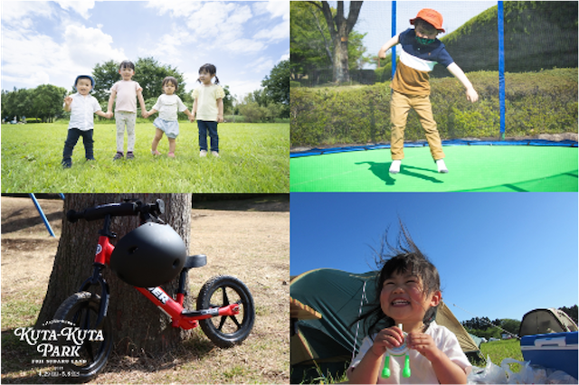富士山麓の大自然の中を、目一杯楽しんでほしい。クタクタになる まで、遊び尽くしてほしい。そんな想いから、富士すばるランド内に、 富士山を望める芝生エリアを設置。様々なソトアソビが楽しめる 「KUTA-KUTA PARK」を開園いたします。特設キックバイクコースや トランポリン、スナックゴルフ、キャッチボール、バドミントンなどのソ トアソビ・コンテンツをご用意いたします。 また、パーク内に、日よけのタープやテント、アウトドアチェアなどが セットになった、ファミリーでくつろげるデイキャンプベース「OPEN-AIR FIELD(オープンエア・フィールド)」も設置。日差しを遮り、子ども たちの元気に駆け回る姿を、のんびりと眺めながらゆっくりと時間を過ごす親御さんにピッタリの環境をご用意しております。