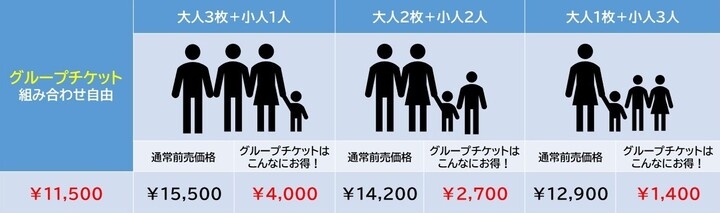 「グループチケット」では、11500円で4名が入場可能になりますので(通常は大人4200円、小人(4歳~小学生)2900円)、大人2人、子供2人だと2700円もお得になります。