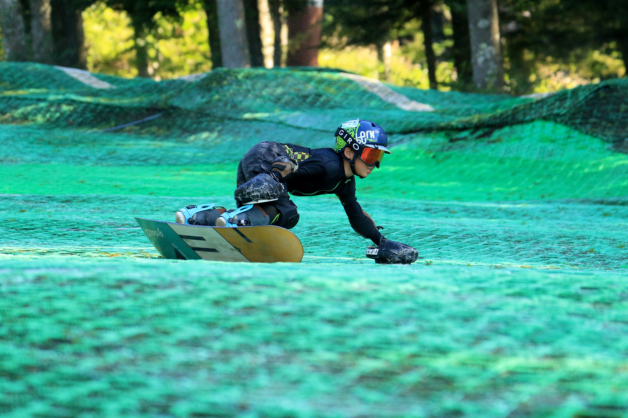 「サマーゲレンデ」は、滑走性に優れた人工マット「カービングマット」を地面に敷き詰めたコース上を滑走し、夏でも雪上に近い感覚でスキー・スノーボードを楽しむことができます。冬のスキー板・スノーボード板・ブーツをそのまま使用し滑走できるので、冬に向けてのスキルアップに最適です。カービングマットはスキー・スノーボードの板のエッジ部分がマットに噛みやすい構造になっている為、カービングターンの様な鋭敏なターンの感覚が得られます。コースは急斜面がなく緩・中斜面中心ですが、約150mのコブコースもあり、上級者の方にも楽しんで頂けるコース設定になっています。