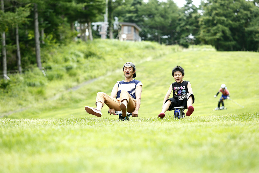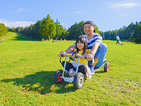 マウンテンカートは、ハンドル、ブレーキのみで操作する3輪カートで、難しい知識や経験がなくても体験できるアクティビティです。冬は初中級者向けのゲレンデとして使用しているふじてんコース内で最長のダイナミックコース(1,300m)の傾斜を利用し、富士山の麓の自然を体感しながら、芝生のコースを走り降りる新感覚を提供いたします。