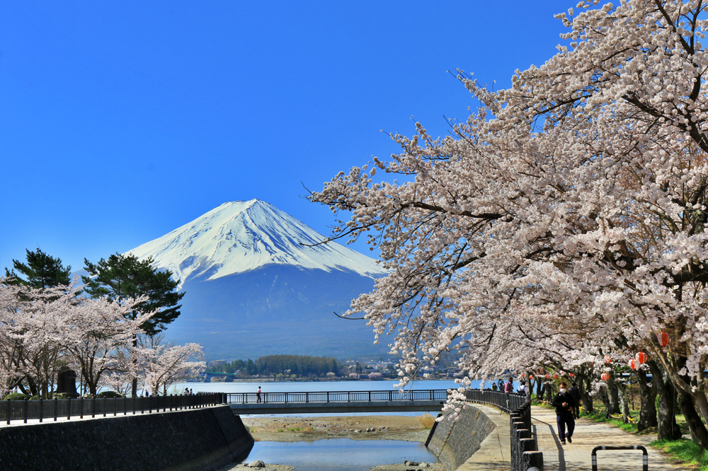 河口湖北岸、円形ホール付近の遊歩道には約200本の桜が植えられていて、河口湖と桜、富士山を同時に眺めることができます。お祭り期間中はたくさんの屋台も出店され、賑わいをみせます。