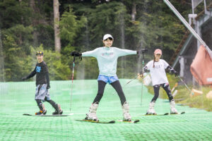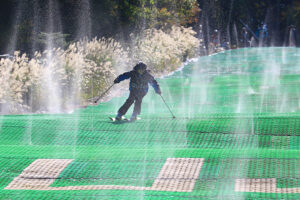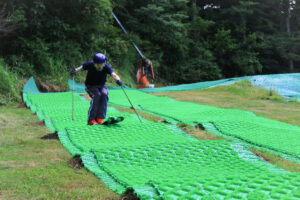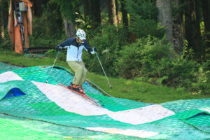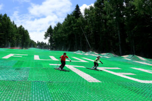 ふじてんリゾートのサマーゲレンデは、「カービングマット」と呼ばれるサマーゲレンデ用に開発された最新スノーマットを使用しています。カービングマットは滑走性とロングターン性能に優れており、スキー・スノーボードどちらも冬の雪上と同じような感覚で滑ることが可能です。さらに、マットの硬さやピンの長さを調節し、スキー板のエッジ(板の両横についている金属部品)がグリップしやすくなるように整備しており、キレの良いターン感覚をお楽しみいただけます。滑走性を高めるためのコースへの散水・ワックスの使用を含め、より良いコンディション作りに努めています。