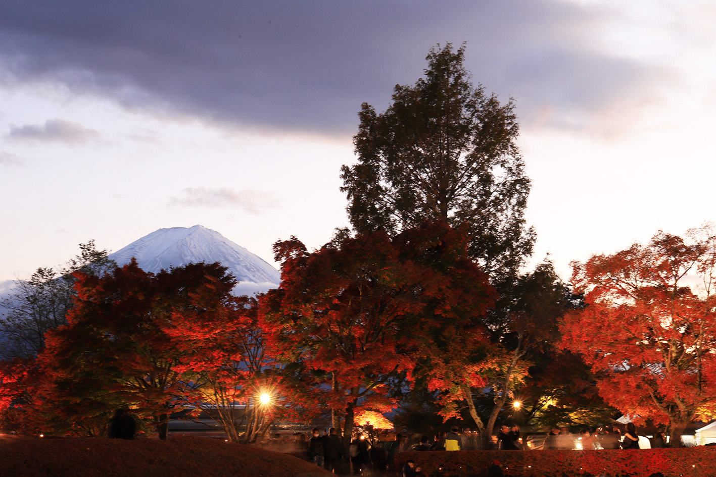 河口湖畔のおよそ400~500本に及ぶ紅葉が、11月上旬から中旬の最盛期には湖にその美しい風景を映し出します。また、「もみじ回廊」では、幻想的なライトアップが催されます。色づくもみじと富士山の共演、夜のライトアップ、キッチンカーや屋台の出店など見どころ満載のイベントです。