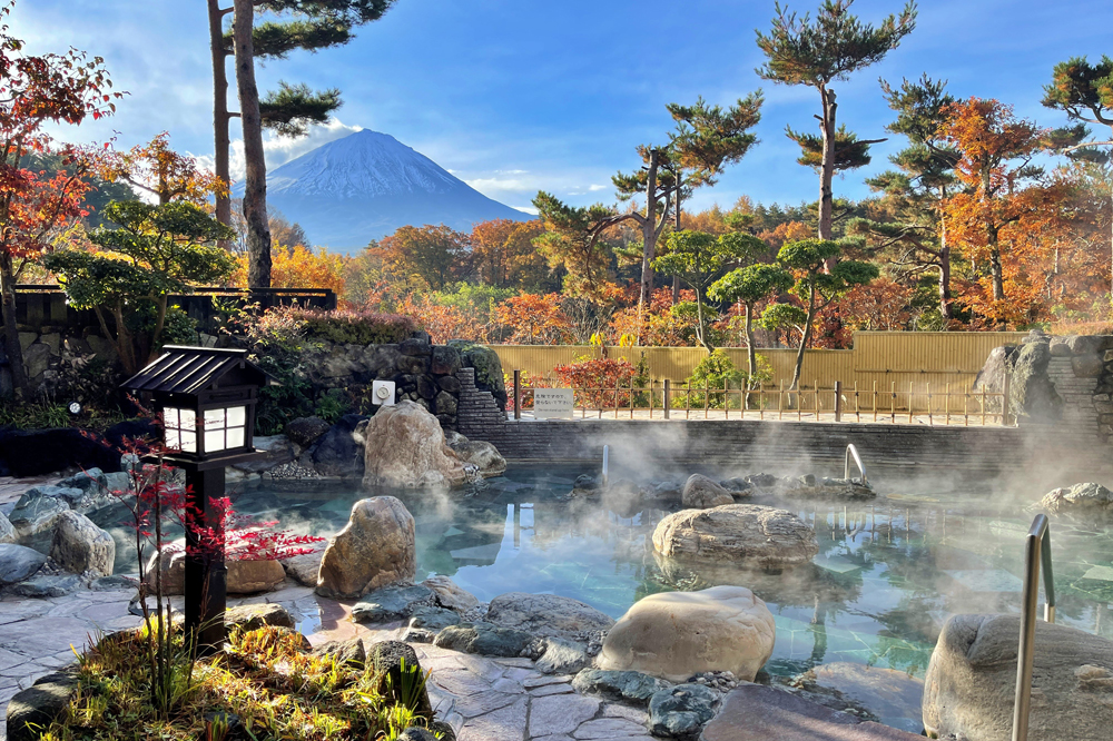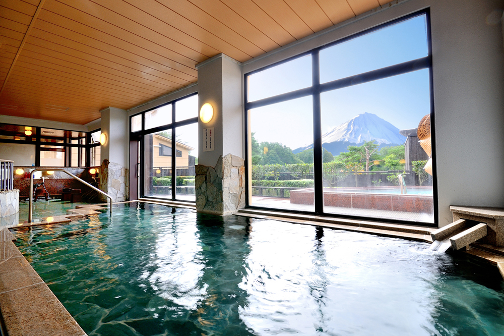 目の前に富士山を眺めながらお風呂に浸かることができる「霊峰露天風呂」や「パノラマ風呂」の他、炭酸泉や洞窟風呂など全16種類のお風呂が揃う日帰り温泉施設です。館内には、お風呂の他にも、日頃の疲れを癒してくれるボディリフレッシュルーム「おあしす」や、地元山梨の食材を使用した料理が味わえるお食事処の「ふじざくら」、SL列車が食事を運ぶ個室のお食事処「お狩場」もございます。他にもお風呂上りにゆっくりお寛ぎいただける無料休憩室、迫力満点の富士山を眺める有料休憩室もございます。お風呂でリフレッシュした後は、館内の充実した設備でくつろぎのひと時をお過ごしください。