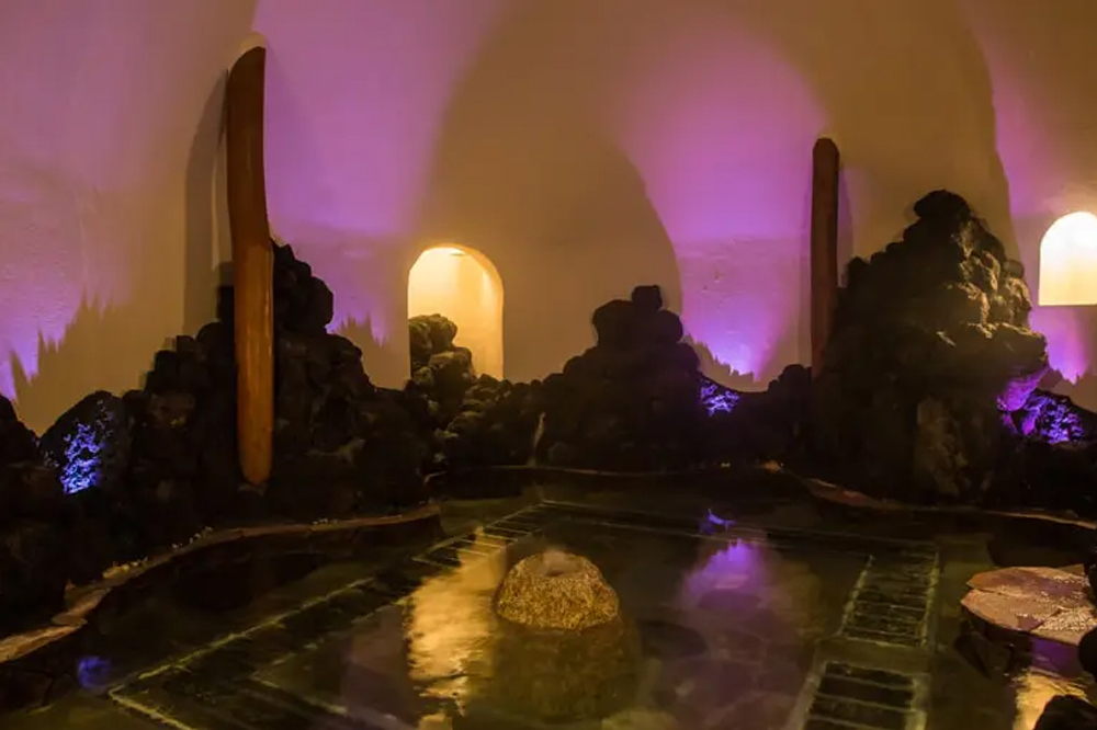[1階] 霊峰露天風呂・霊峰湧水風呂・洞窟風呂・香り風呂・蒸し風呂・サウナ・ 炭酸泉 [2階] 高見風呂・パノラマ風呂 [3階] 貸切風呂(幸福の石風呂・目薬の木風呂・炭風呂・桧風呂・かまど風呂・水晶風呂) 迎賓風呂泉質:カルシウム、マグネシウム、ナトリウム、硫酸塩、塩化物温泉(弱アルカリ性低張性低温泉)